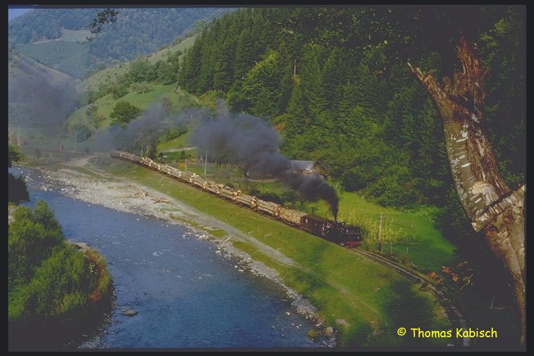 schönen Dampffahne entschwindet der Holzzug mit der 764 469 in den Wäldern.